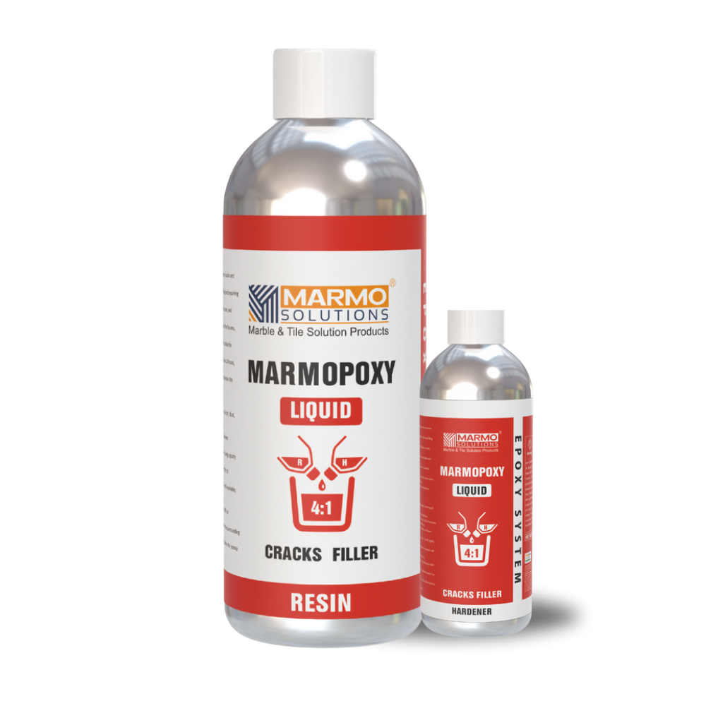 MARMOPOXY-LIQUID 4:1: A two component resin-based filler featuring epoxy resin and a modified amine hardener. Ideal for closing and filling cracks and larger pores in colored stones, ensuring superior strength and durability.